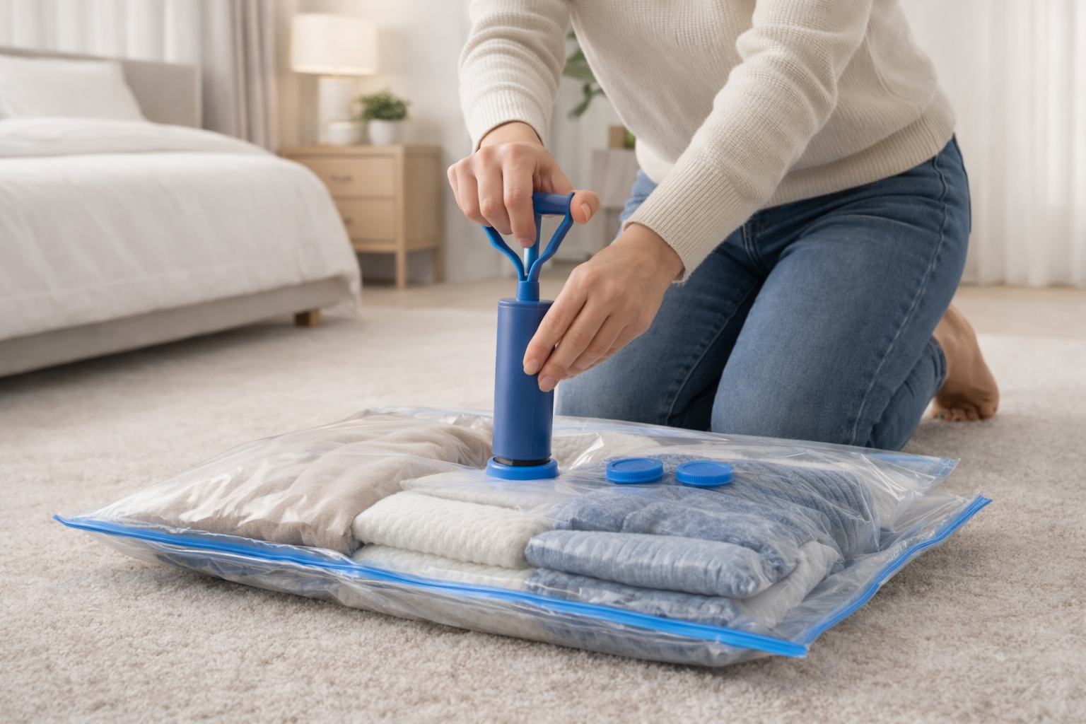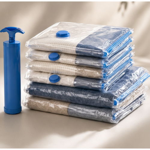 Onze vacuüm opbergzakken besparen je tot 80% ruimte – ideaal voor kasten, slaapkamers, koffers en opbergboxen. Geen gedoe, geen ingewikkelde systemen. Gewoon effectief.